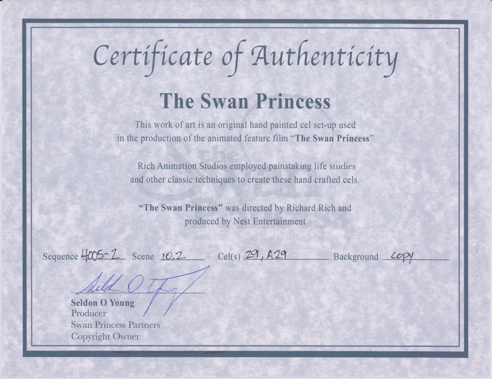 All Swan Princess original hand-painted animated art cels were created by artists in our Burbank and Hollywood studios in the United States.