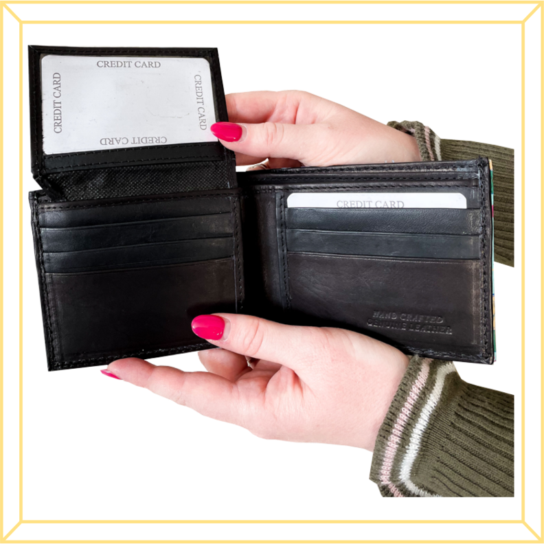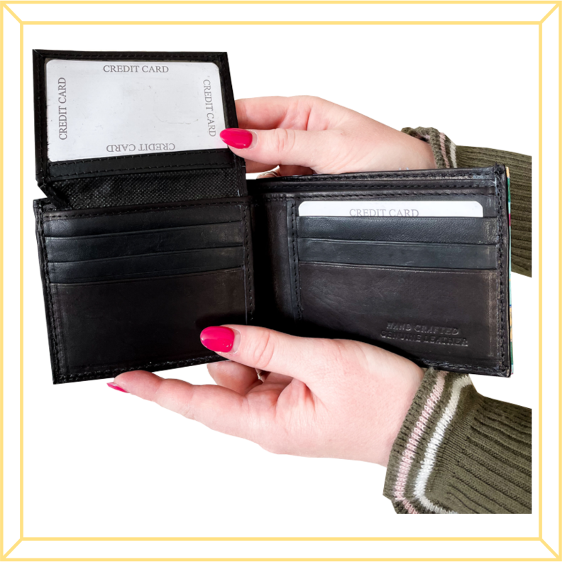 Wallet includes: eight credit card slots and three bill sized pockets, one of them zippered. 4.5 x 3.5 inches when closed.
