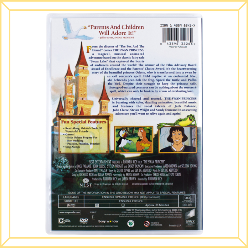 Universally cheered and revered, The Swan Princess is bursting with color, dazzling animation, beautiful music and features the vocal talents of Jack Palance, John Cleese, Steven Wright and Sandy Duncan! It's an exciting adventure you will want to relive again and again!
