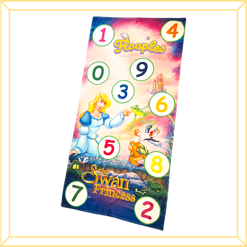 Deluxe beach towel featuring Swan Princess art and characters designed as a toss to target game for letters and numbers. Each towel comes 8 bean sacks for tossing and a carrying bag.